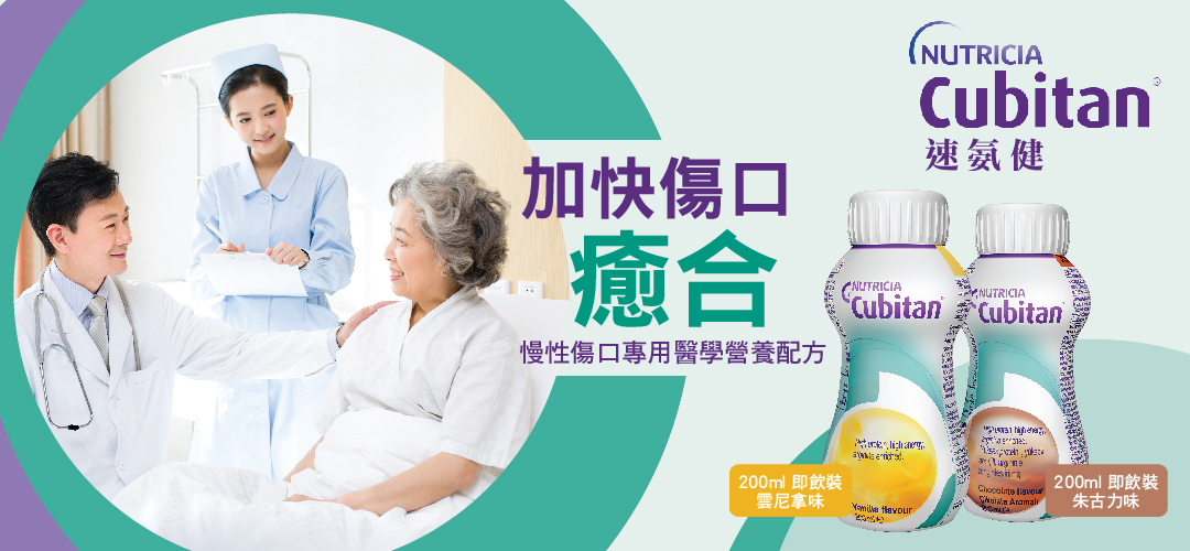 營養不良會降低皮膚的修復和耐受缺氧的能力,是減慢傷口癒合的重要因素。國際壓瘡治療與預防指引指出,病人需要額外熱量、蛋白質及其他重要營養素,如精氨酸、鋅、維他命C、E等,應付傷口癒合。多項臨床研究顯示,Cubitan速氨健有效促進慢性傷口患者的傷口癒合,紓緩傷口的嚴重程度,療效迅速,有助預防出現感染等嚴重併發症,並減低醫療開支。即飲樽裝,開瓶後便可飲用。