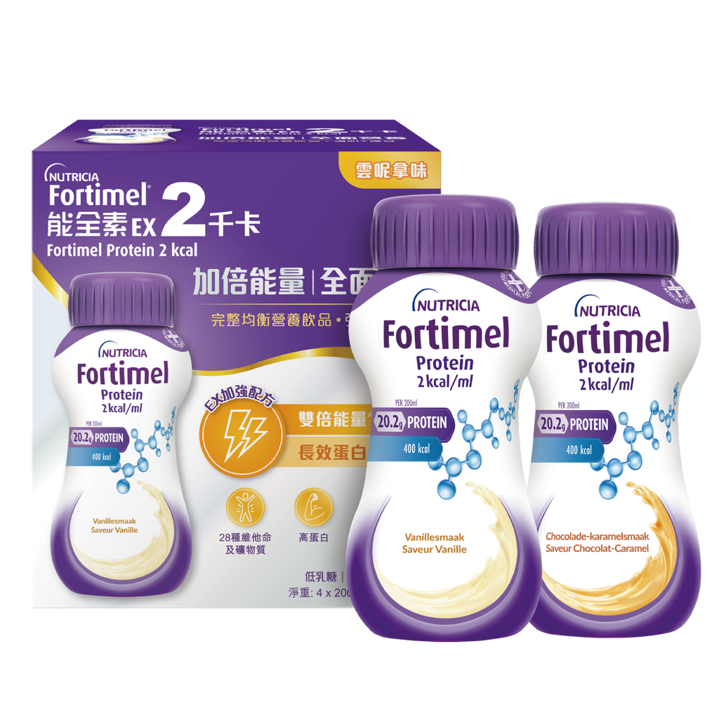 Fortimel Protein 2 Kcal 能全素 EX 2千卡 是完整均衡營養品,提供加倍能量和全面營養。 EX加強配方提供雙倍能量^,滿足身體額外需求,幫助提升身體能量水平,增強體力。配方精選優質長效蛋白,每支含有20.2克蛋白質,有助修復和增強肌肉組織,促進肌肉健康。適合需要改善營養狀況的人士,尤其是能量及蛋白質需求增加的人士。可作為日常營養補充品或作爲代餐。