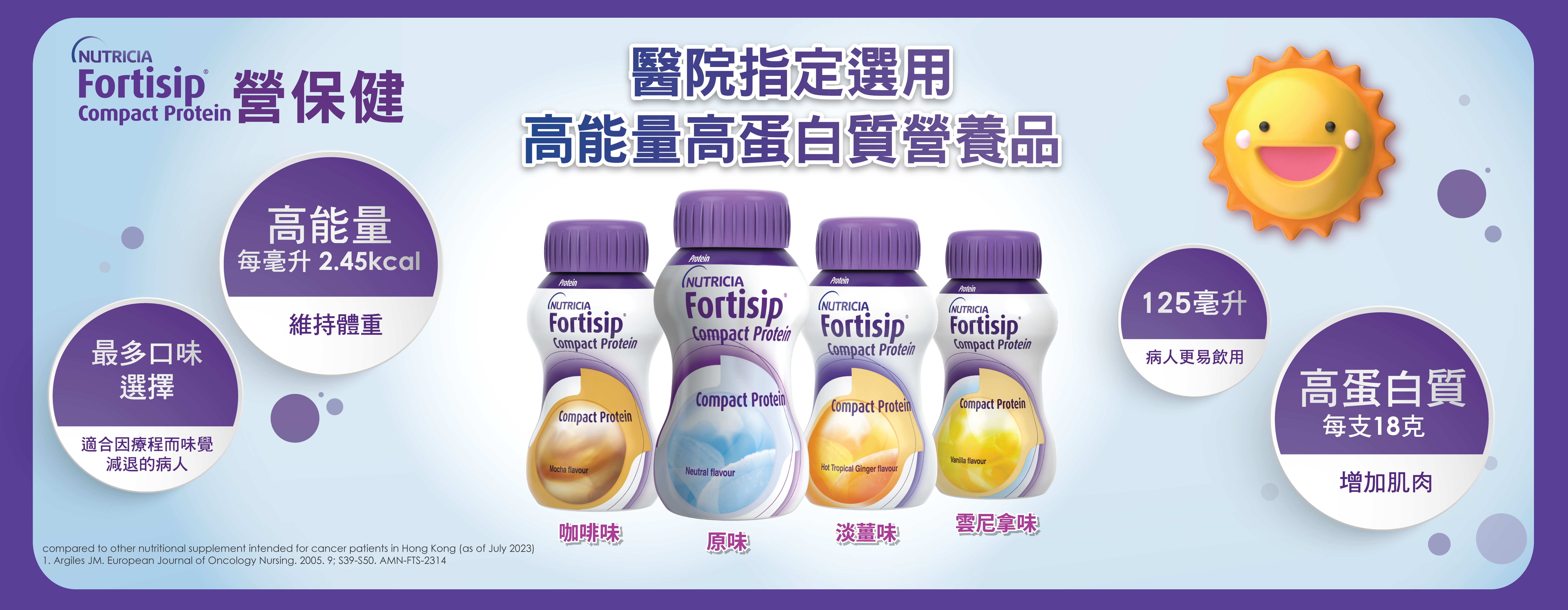 對於需要增加營養攝取,而又較難從日常飲食中計算正確份量,Fortisip Compact Protein 營保健有準確的營養成份,讓你在治療路上更輕鬆達到營養目標。其中癌症病人於治療前、中、後期更需要比一般人多1 倍營養,癌症或療程有可能造成不同副作用反應,例如食慾不振、口腔潰瘍、吞嚥困難等,會令病者進食量不足、營養不良、及體重下降。研究顯示,如體重下降超過5%,將影響治療效果,或需中斷療程。