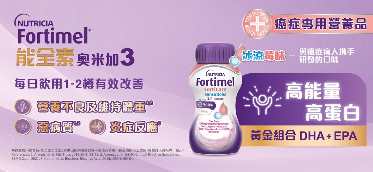 Fortimel FortiCare Sensations 能全素奧米加3 是一個癌症專用營養品,含有適量的魚油、蛋白質和熱量,有助病者順利完成療程。產品的高能量和高蛋白幫助病者輕鬆滿足營養需求及維持體重和肌肉量1,2。當中含有具有抗炎特性的奧米加3脂肪酸(EPA和DHA),有助於減少體内炎症反應3。同時含有高維他命D有助於維持免疫功能。此外,125毫升的細樽裝方便飲用,減輕進食壓力。本產品不含麩質,與癌症病人攜手研發的口味,冰涼莓味能提供冰涼的口感,特別為有口味改變的病者而設計。每日飲用1-2樽有效改善癌症相關引起的營養不良情況,並減輕體内炎症反應,並幫助改善惡病質,為療程做好準備。