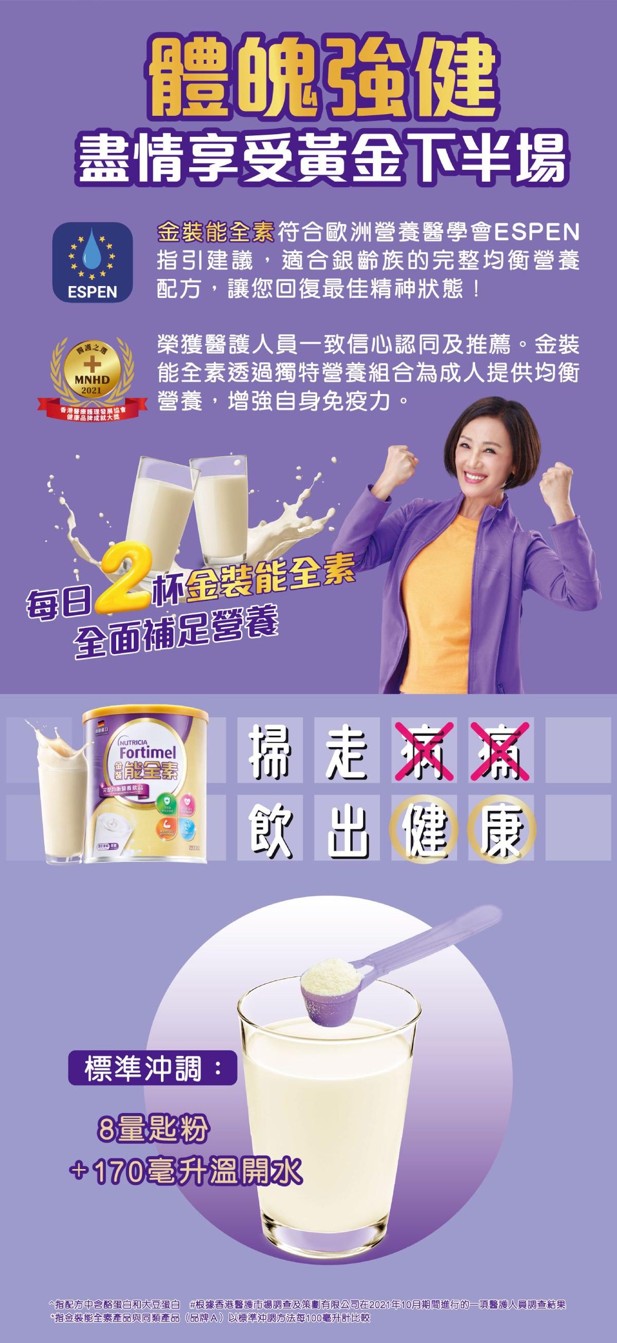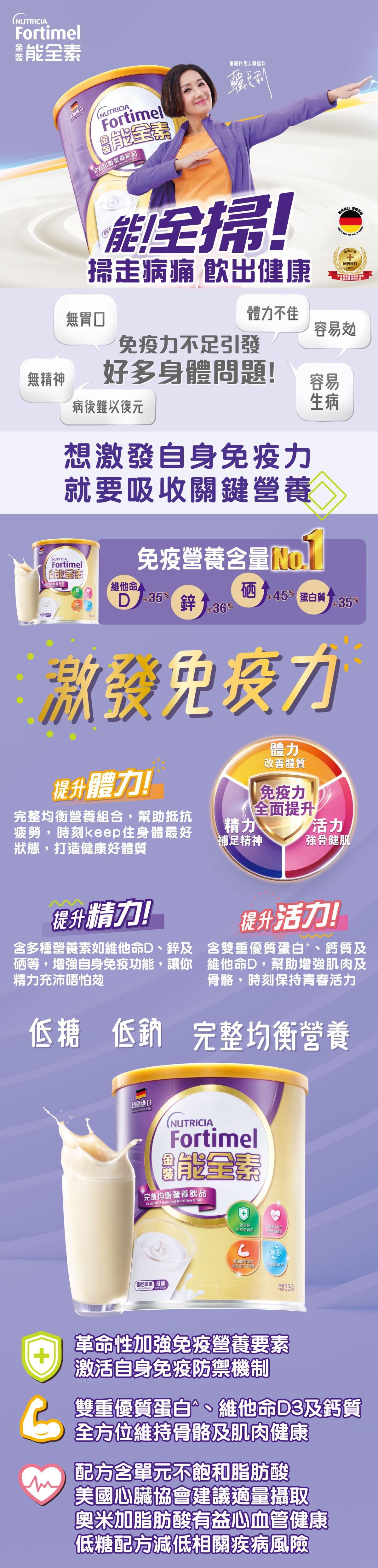 Fortimel金裝能全素有最高免疫營養要素:維他命D、鋅、硒及優質蛋白質,每日2杯,助你掃走病痛,飲出健康!Fortimel金裝能全素 低糖低鈉、營養完整均衡,適合一般成年人作為補充飲料或唯一的營養來源。日日飲激發免疫力!